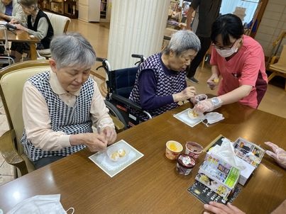 おやつづくり(通所リハビリテーション) 2024年06月25日取組報告 本日の通所リハビリテーションのおやつは、手作りドーナッツ♡ ご利用者に自分で選んでジャムやチョコをつけていただきました☺ 美味しい♡喫茶 やすらぎに来たみたい☺ 大満足していただきました。