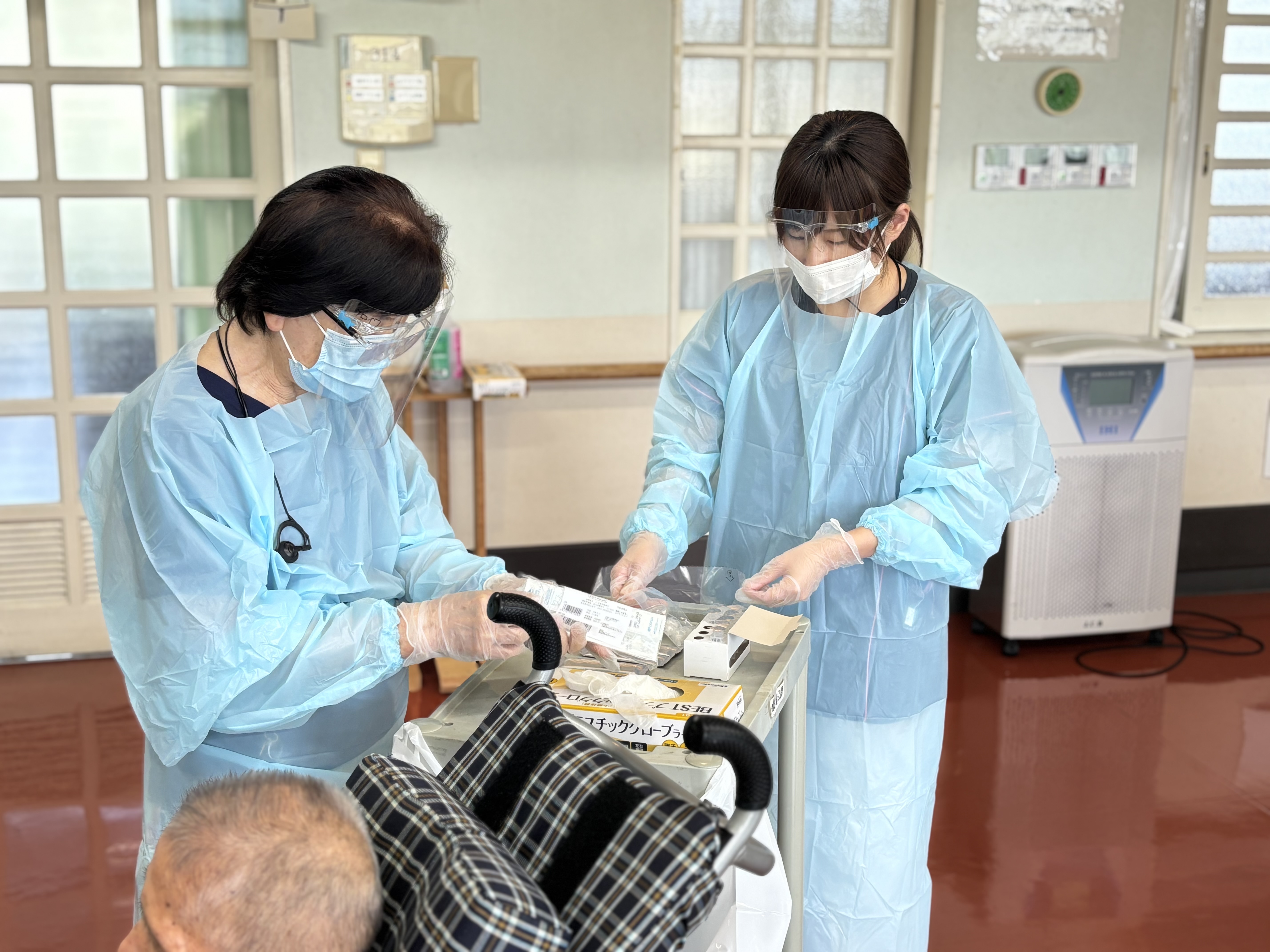 先日、配属になった技能実習4期生もガウンテクニックの練習をしました。