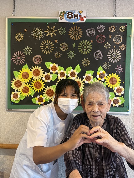ひまわり 2025年08月19日取組報告 まだまだ暑い日が続きます。 3階の皆さんと向日葵の壁紙の前で記念撮影。 向日葵に負けないくらいの笑顔で撮影♡ 実習生も今週で実習終了。 高齢者の気持ちが分かる介護福祉士になってもらいたいです。
