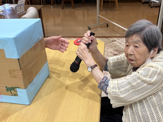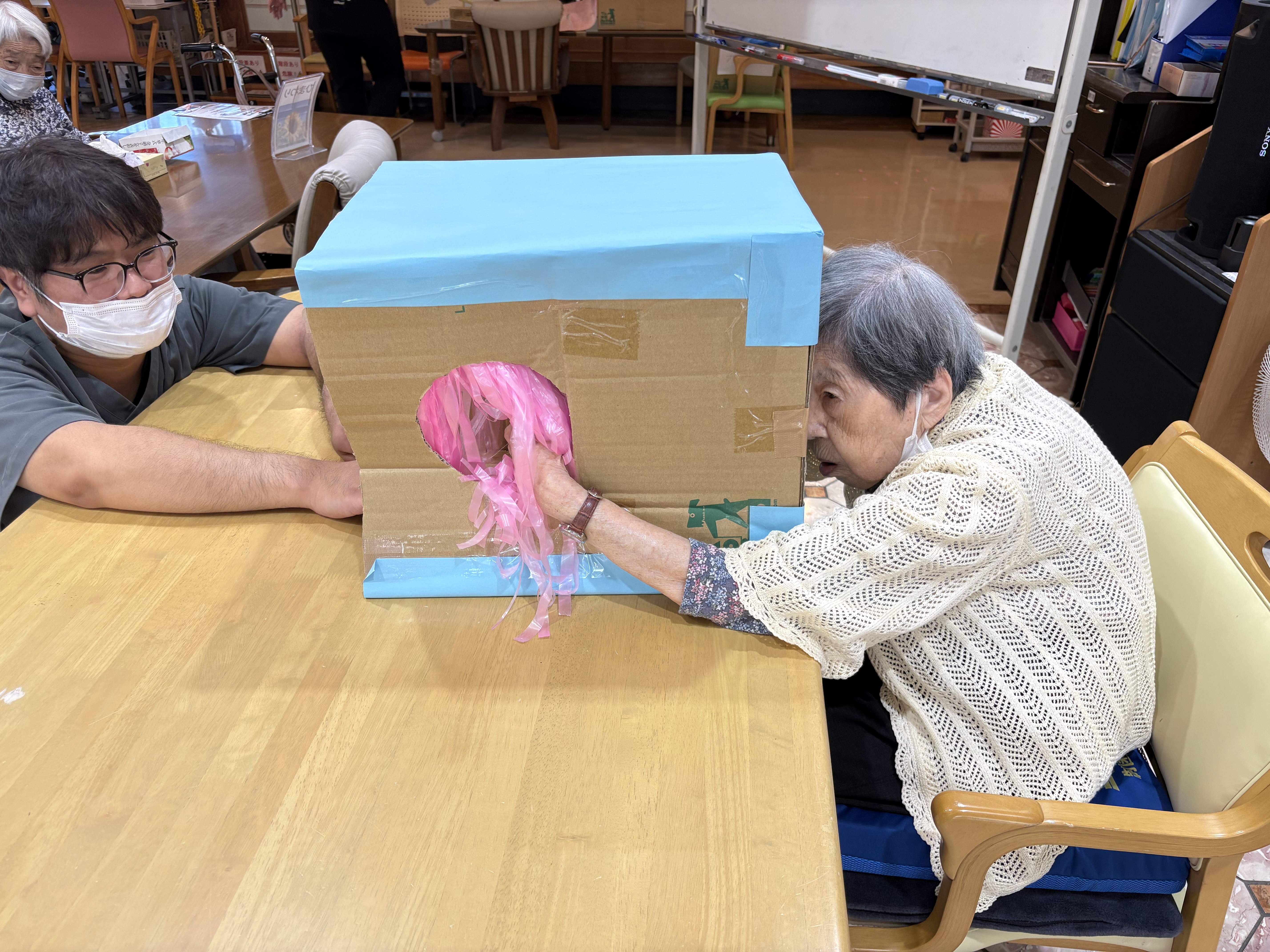 感触ゲーム 2025年10月01日取組報告 本日は、箱の中に何があるかあてる感触ゲーム☺ ボーリングのピンを触っていただきましたが、『すりこぎ棒?こけし?』となかなか難しい・・・ 最後まで迷われていました。本日も楽しく、通所リハビリ営業中です。