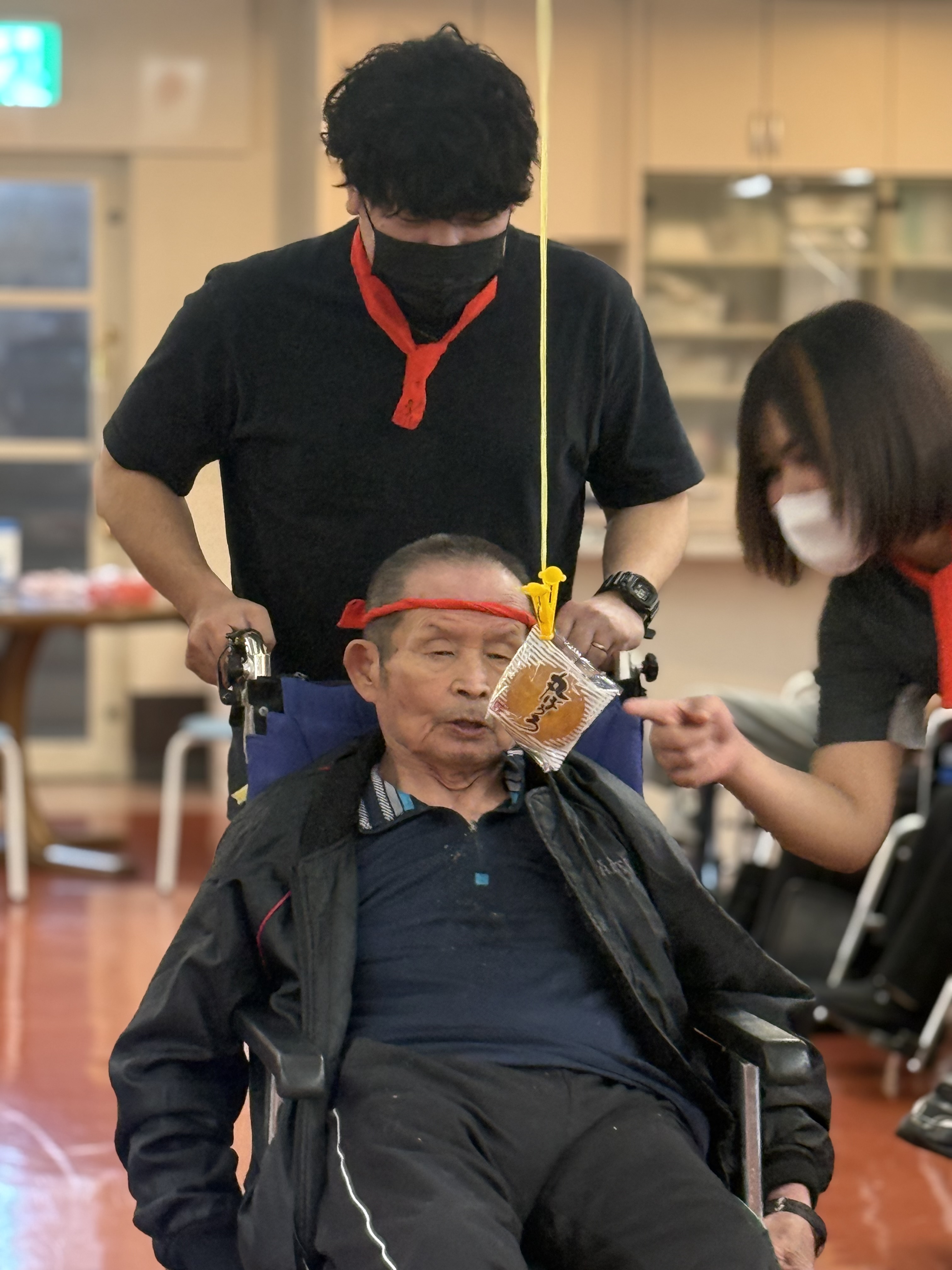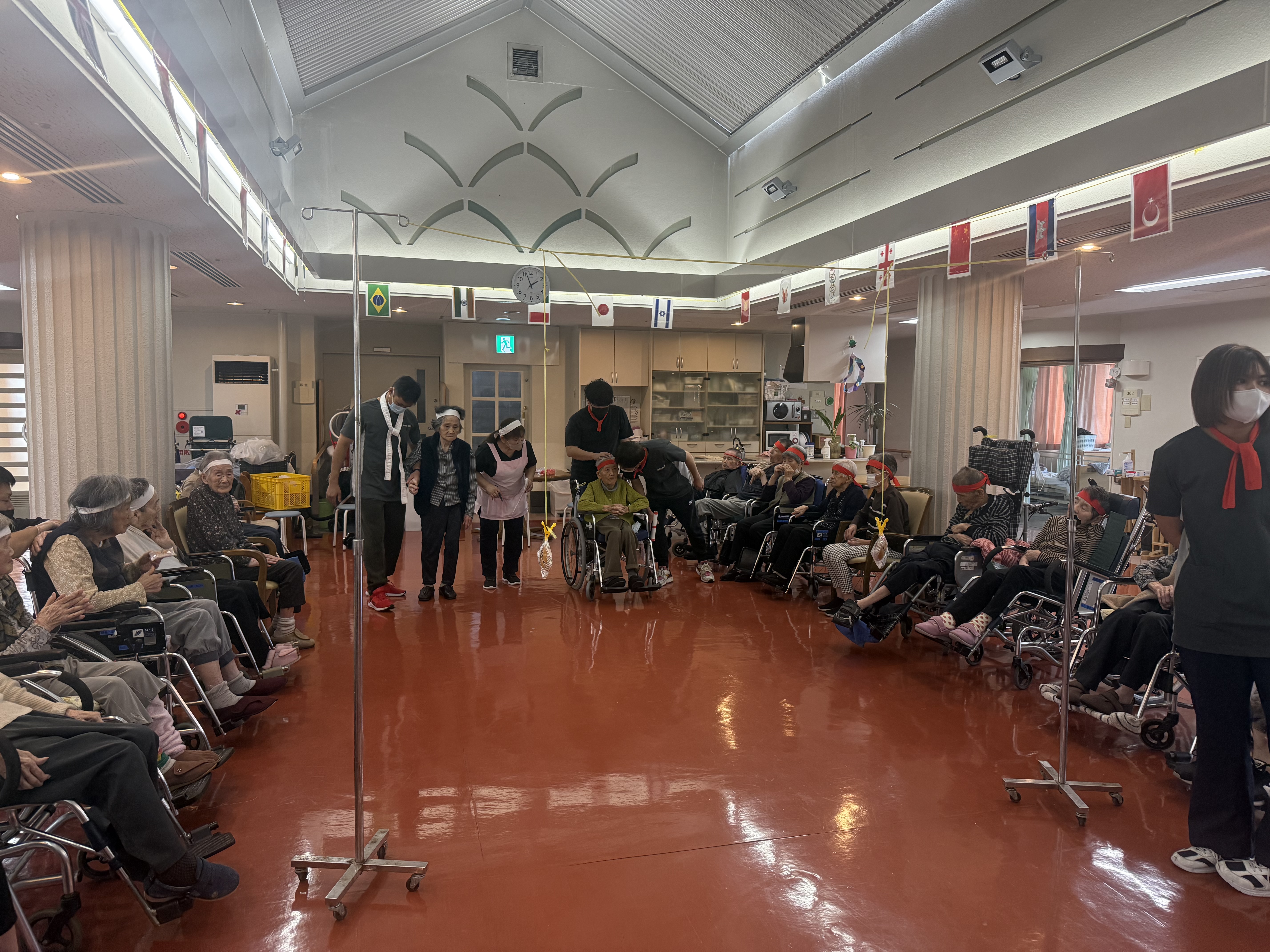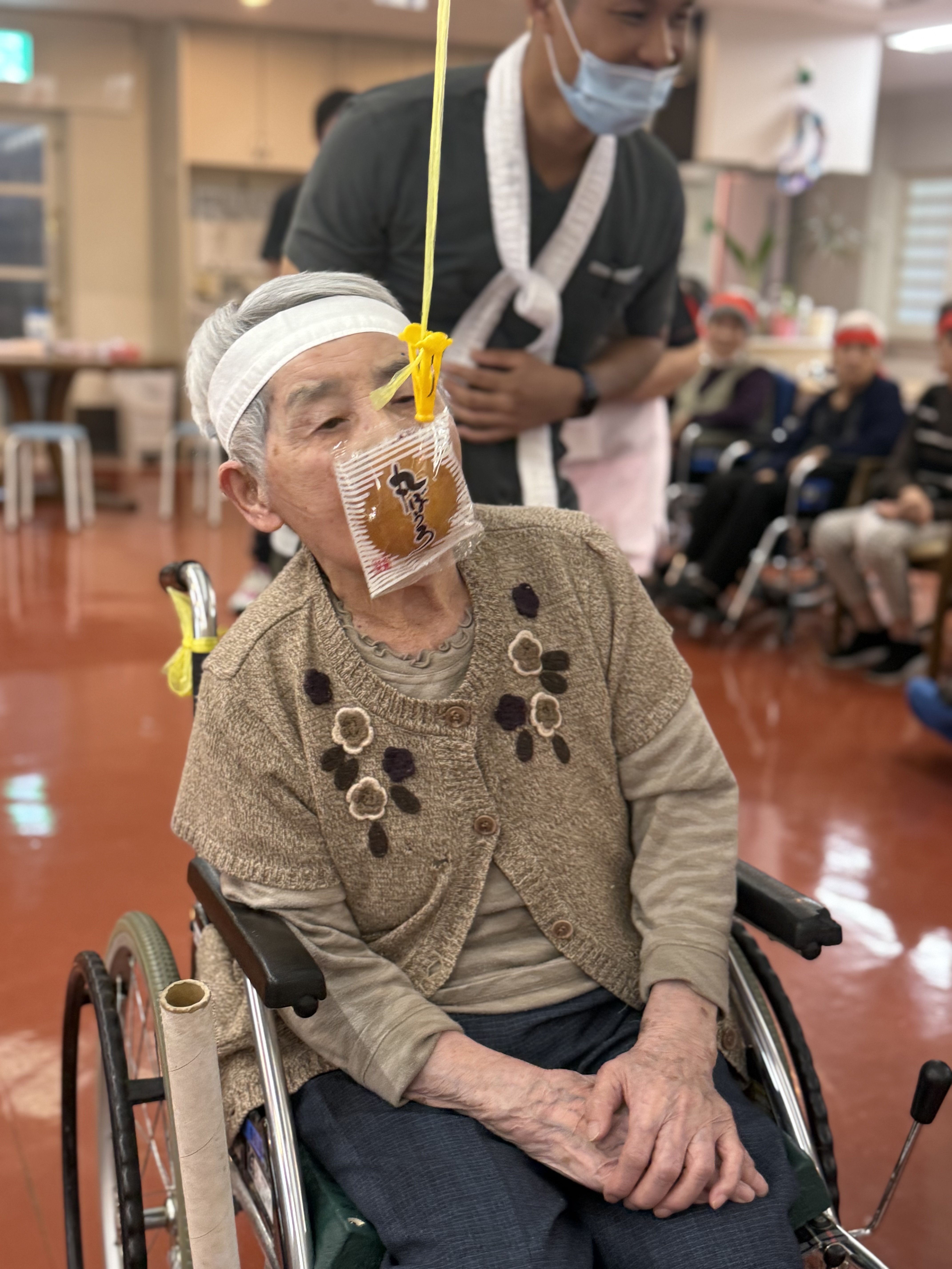 運動会(3階入居者様) 2025年11月04日取組報告 本日は、3階ご利用者の運動会☆ 日頃のリハビリの成果を発揮し、盛り上がりました。 パン食い競争 紅組が勝ちましたが、ご利用者もスタッフも楽しい運動会でした♡