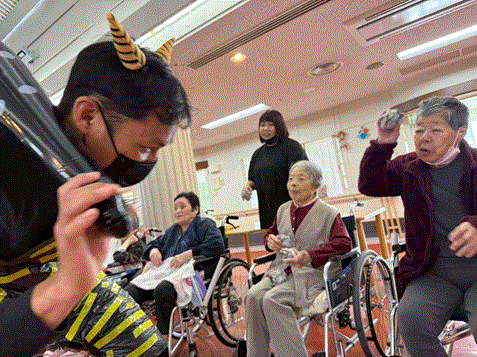 節分(3階) 2026年02月04日取組報告 昨日は節分(3階)の様子です。 迫力満点の鬼の登場です。 真剣に豆をなげられていました。 最後は、仲直りができたようです。 『1年間健康に過ごせますように』という願いをこめて鬼退治ができたようです。