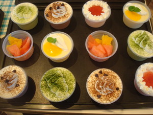 【デザートバイキング】・ババロア(バニラ・イチゴ・チョコ・抹茶) ・抹茶ケーキ ・桃のタルト ・シュークリーム ・果物
