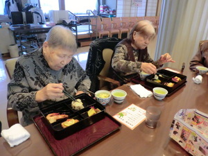 【献立(常食】・きのこ飯 ・鮭の柚庵焼き ・お煮しめ ・カブとささ身の酢の物 ・カステラ ・茶碗蒸し