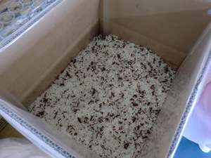 ←α米の五目飯。この一箱で50食分が作れます。お湯を入れて15分で出来上がり。