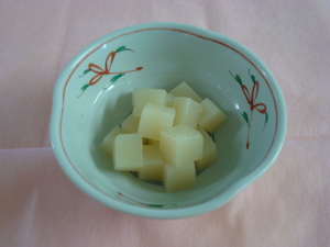 以前作成した別のレシピを参考に、ミキサーにかけたものを流し缶に流し固めた後、さいの目に切って盛り付けました。