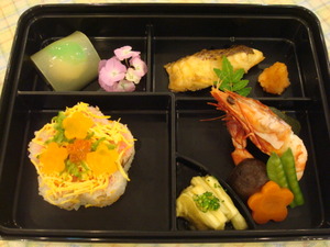 【献立(常食)】・花寿司 ・鯛の木の芽焼き ・お煮しめ ・茄子の薬味たれかけ ・和菓子 ・茶碗蒸し