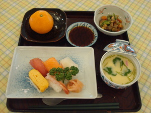 【献立(常食)】 ・にぎり寿司 ・炒り鶏 ・生姜甘酢漬け ・茶碗蒸し ・みかん