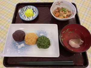 【献立(常食)】・三色ぼた餅 ・野菜の五目煮 ・潮汁 ・沢庵漬け
