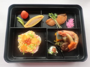 【花見御膳】・花寿司 ・鮭の照り焼き ・春野菜のお煮しめ ・春菊とささみのおろし酢和え ・どら焼き ・果物
