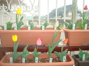 赤、白、黄色のチューリップが並んで、花を咲かせました(^0^)